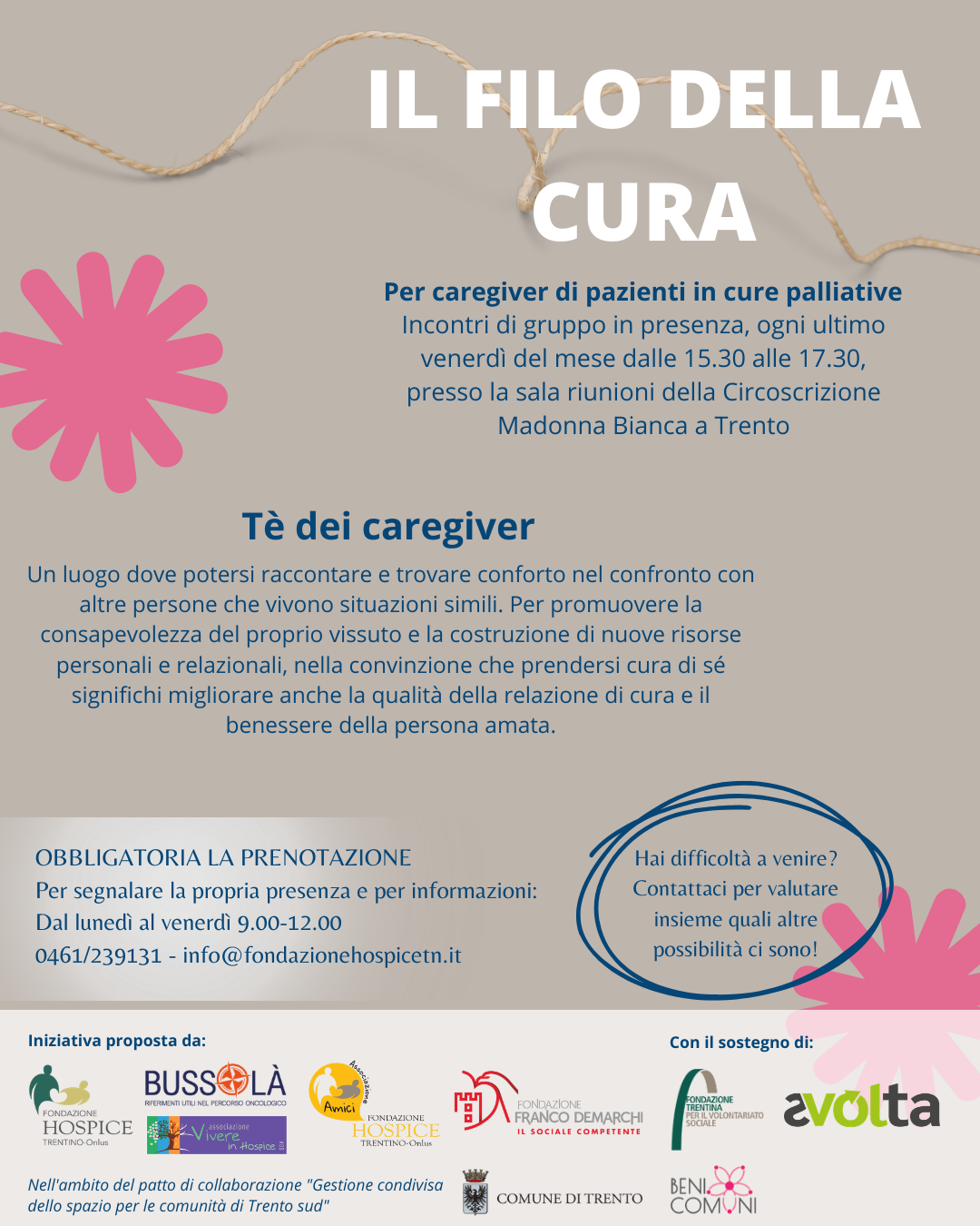 Il primo progetto, promosso dalla Fondazione Hospice Trentino ETS, si intitola “Il filo della cura – Tè dei caregiver”. Si tratta di incontri di gruppo mensili, gratuiti e su prenotazione, guidati da due psicologhe.
