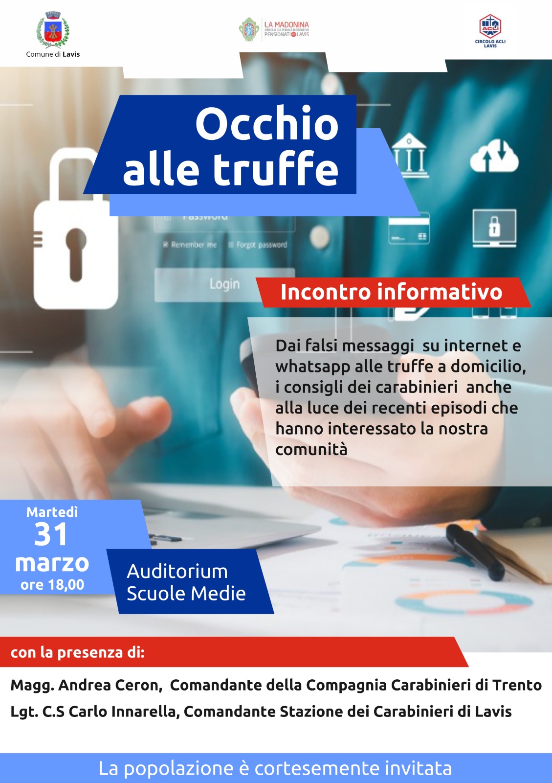 Un incontro per informare, prevenire e proteggere la comunità, in particolare le persone più esposte ai raggiri. Martedì 31 marzo alle ore 18, all’Auditorium delle scuole medie di Lavis, è in programma “Occhio alle truffe”, un momento informativo promosso dall’amministrazione comunale, in collaborazione con il Circolo Acli di Lavis e il Circolo culturale e ricreativo “La Madonnina”.