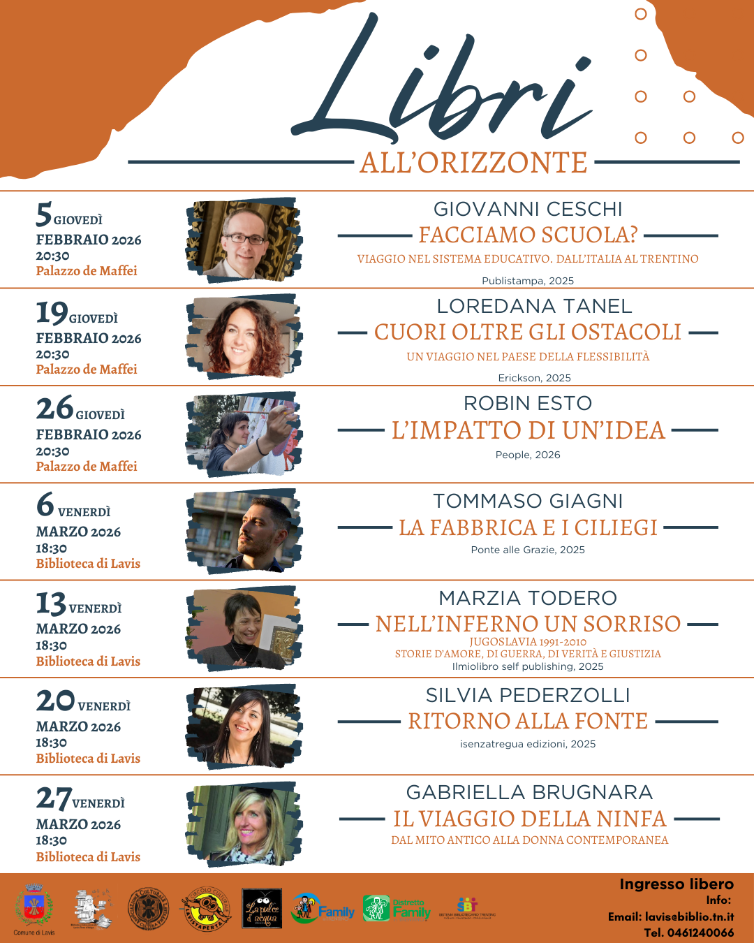 C’è una sorta di ponte fatto di pagine, a Lavis, che dall’inverno porta alla primavera. È la nuova rassegna di presentazione di libri organizzata dal Comune con la biblioteca locale, in collaborazione con il Circolo Culturale Lavistaperta e l’Associazione Culturale Lavisana. Si chiama “Libri all’orizzonte” e prevede sette incontri, tra febbraio e marzo, a Palazzo de Maffei e in biblioteca, con altrettante autrici e autori.