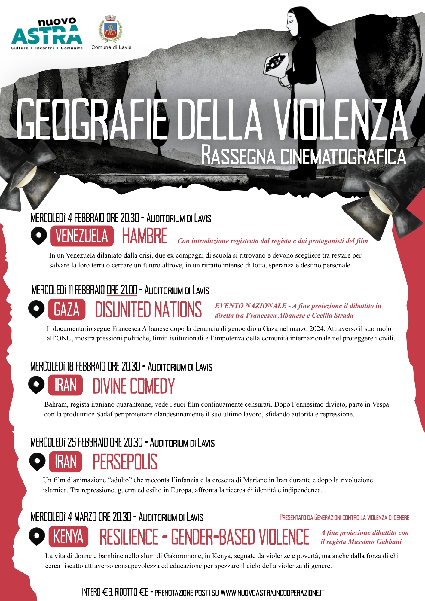 Il nuovo programma del cinema Nuovo Astra, situato presso l'Auditorium di Lavis, un'occasione di ispirazione e scambio culturale per tutti i cittadini del Comune. Da mercoledì, per cinque settimane consecutive, la rassegna "Geografie della Violenza", nata dall'esigenza di raccontare la guerra in svariati modi: dall'animazione al documentario, dal comico al tragico, per non farci dimenticare mai cosa succede in luoghi geograficamente distanti tra loro, ma accomunati da odio e violenza.