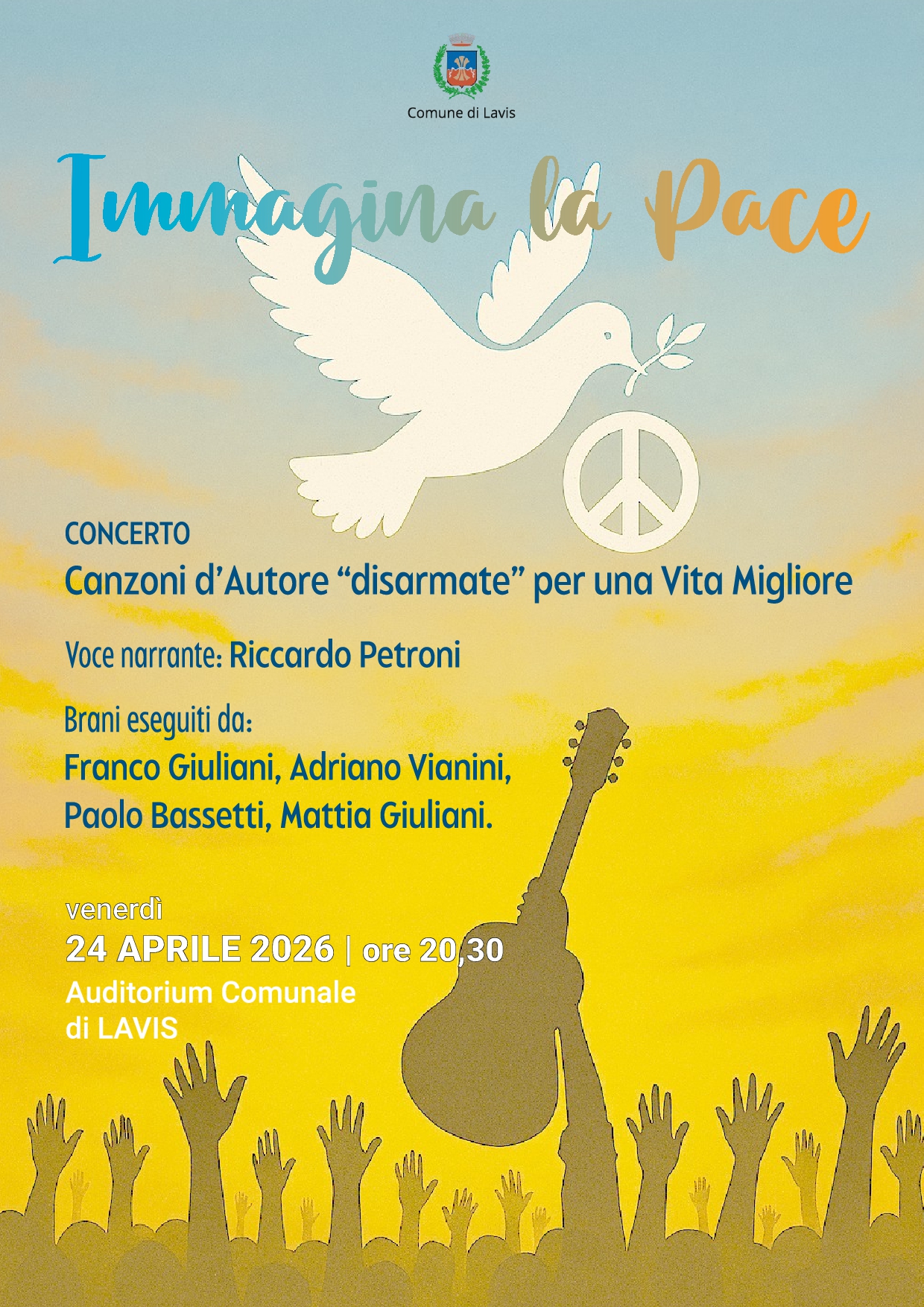 Una serata di musica e riflessione, a ingresso gratuito, per interrogarsi sul presente e riscoprire il valore della pace. Venerdì 24 aprile alle ore 20.30 l’Auditorium comunale di Lavis ospiterà “Immagina la pace”, concerto di musica d’autore dedicato ai temi della guerra e della convivenza tra i popoli.