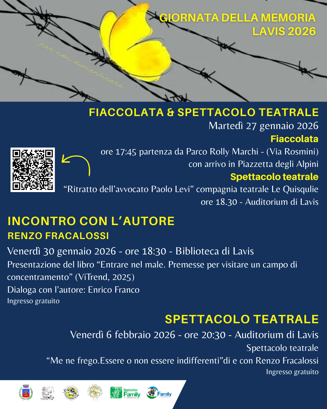 Anche il Comune di Lavis aderisce alla Giornata della memoria per commemorare le vittime della Shoah, con vari appuntamenti in programma da martedì 27 gennaio a venerdì 6 febbraio, organizzati con la Biblioteca e con la collaborazione del circolo culturale Lavistaperta e l’associazione “Il teatro delle quisquilie”.